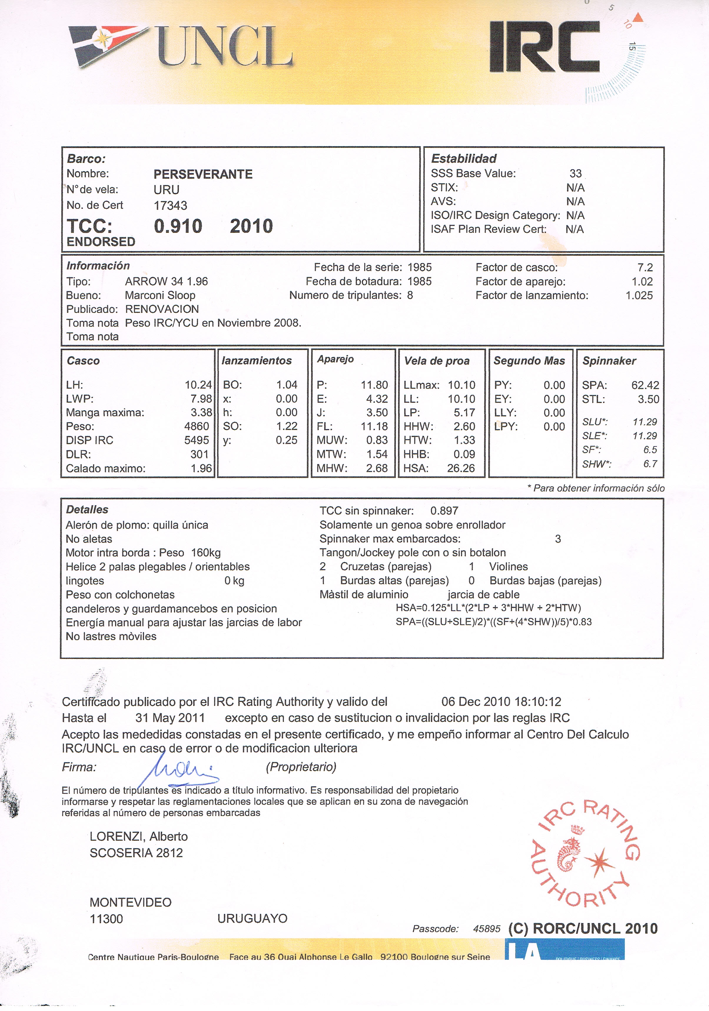 Tiene 10,20 metros de eslora, 3.45 de manga, 1.44 de puntal. Con esas medidas llega a un desplazamiento de 4.9toneladas. Su calado es de 1,96m, con un quillote de plomo de 1000kg.